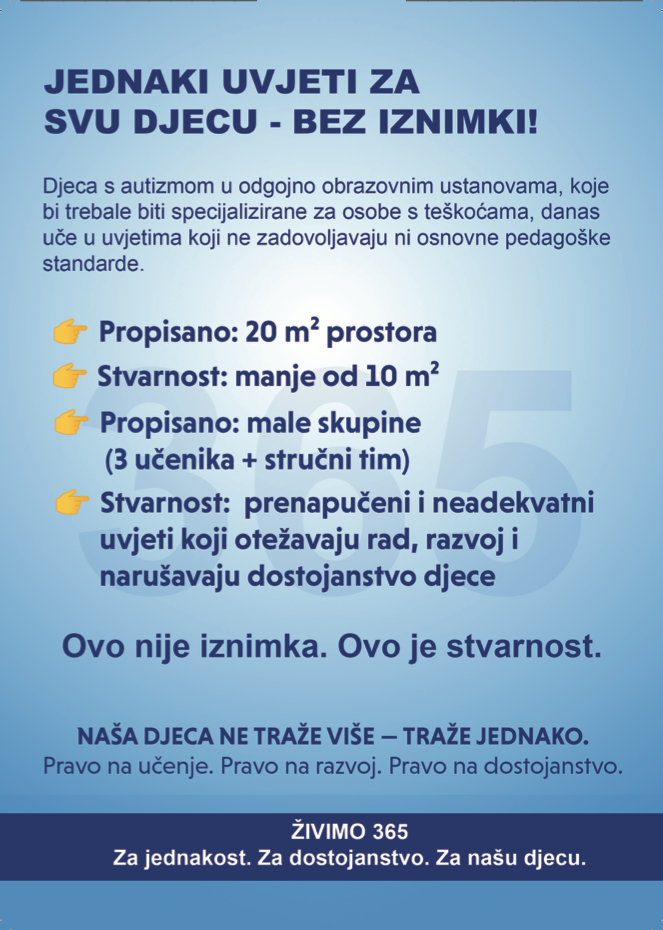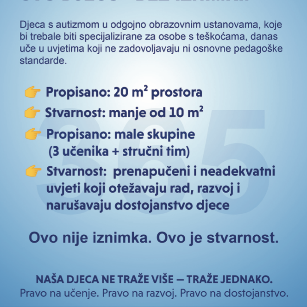 Posebno zabrinjava činjenica da Osnovna škola Centar za autizam Split ne djeluje u samostalnoj, adekvatno opremljenoj zgradi, već u suterenu stambene zgrade. Takvi uvjeti nisu dostojni obrazovnog sustava niti djece kojoj bi trebao pružiti podršku.