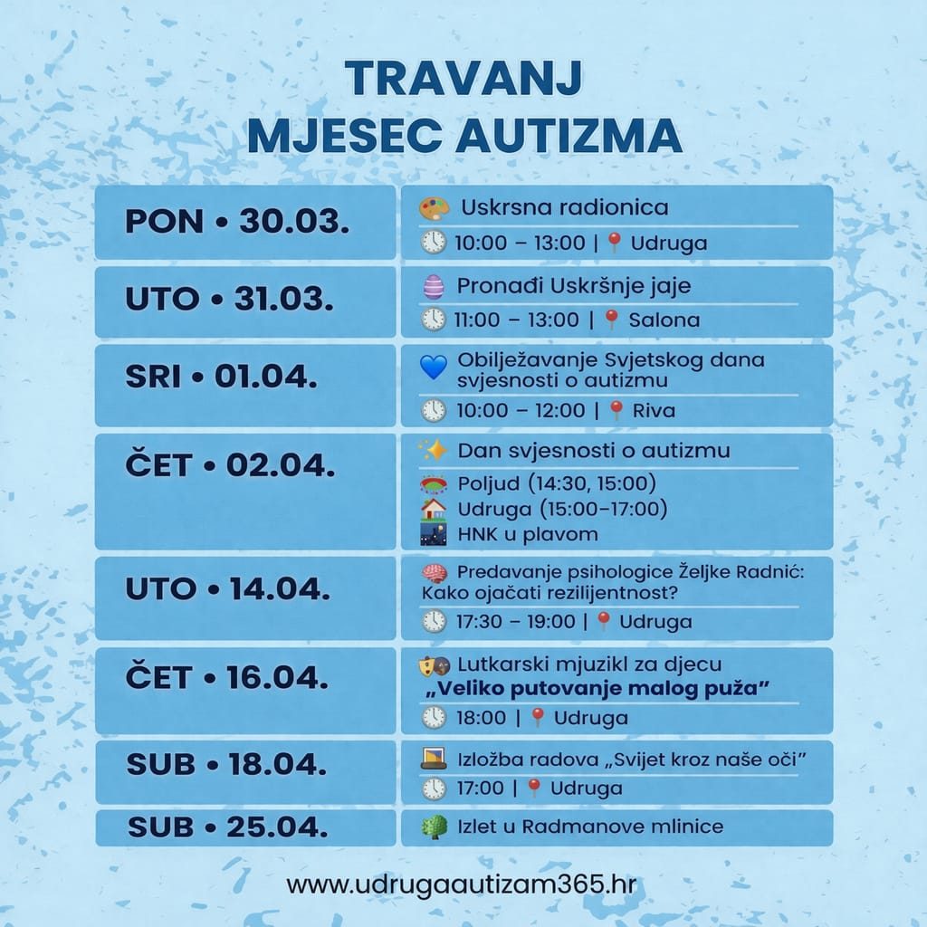 i ove godine travanj posvećujemo podizanju svijesti, zajedništvu i borbi za prava naše djece. Pripremili smo niz aktivnosti kroz koje želimo pokazati koliko je važno razumijevanje, podrška i uključivanje 💙